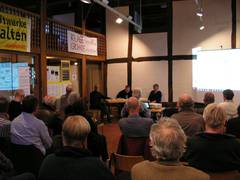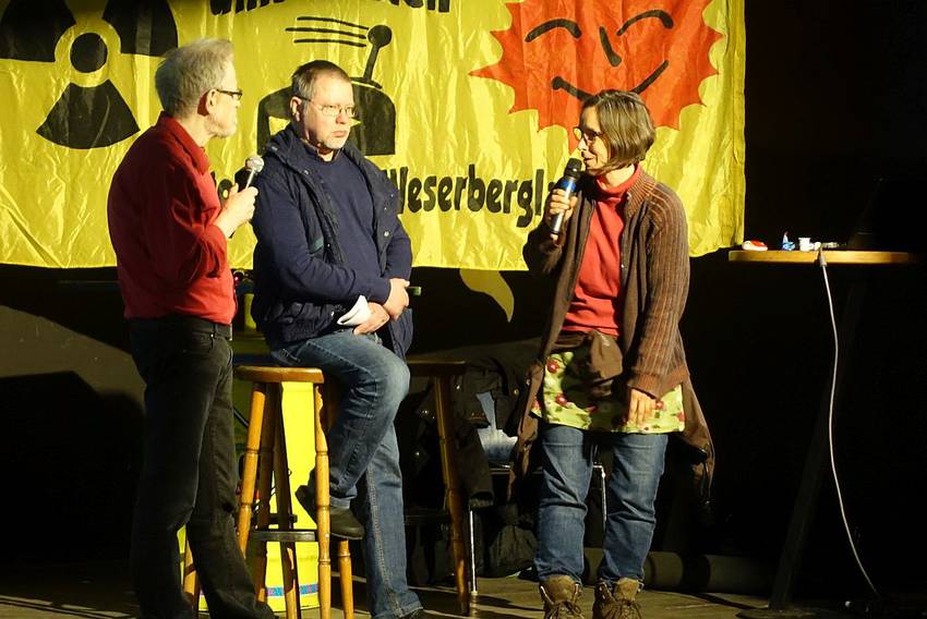 Die Veranstalter hatten die Form einer Interviewrunde gewählt: Hans-Peter Leiding (Grohnde) als Kläger und Karsten Schmeißner (Detmold) vom Rechtshilfefonds Atomerbe Grohnde e.V. standen der Moderatorin Claudia Staubach Rede und Antwort.