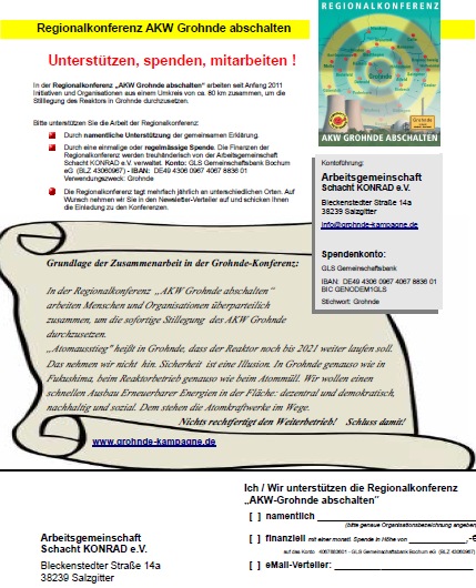 Unterstützungserklärung ausdrucken, unterschreiben und an die Arbeitsgemeinschaft Schacht KONRAD schicken oder einfach ein Mail an info(ätt)grohnde-kampagne.de